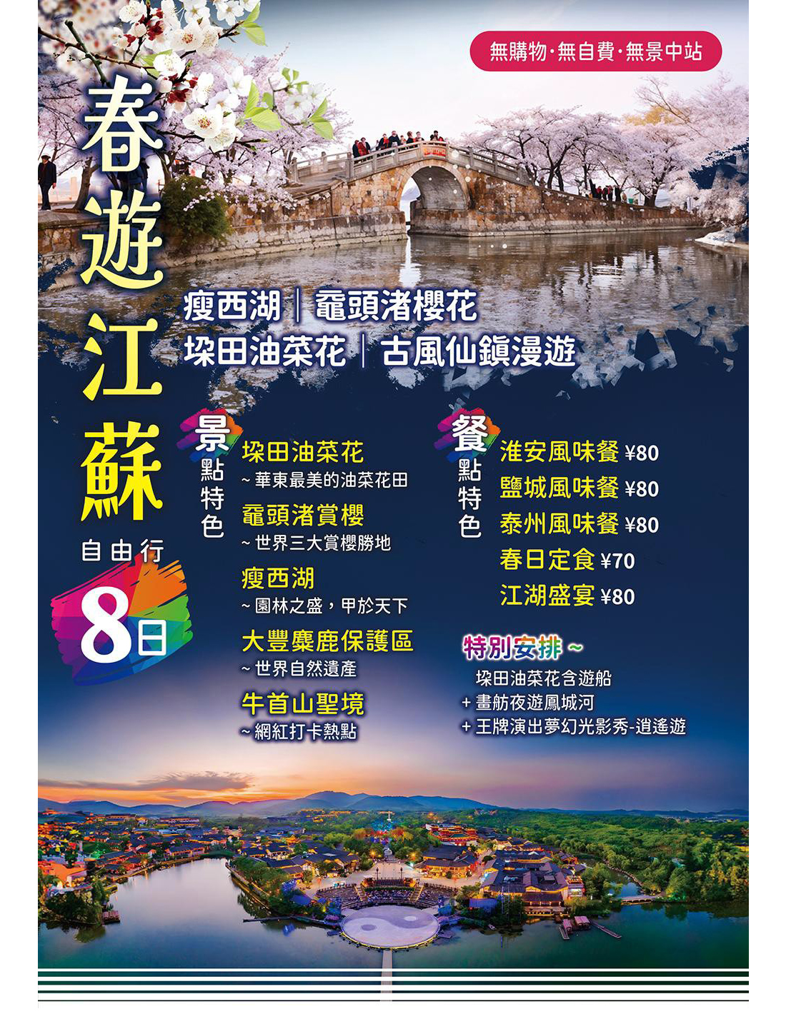 【為妳花開滿城之靈山小鎮拈花灣】位於太湖之畔,與大佛為鄰,作為世界佛教論 壇的永久會址,是靈山繼梵宮之後的又一精品力作。拈花灣作為東方禪意度假勝地, 擁有極深的禪意蓮花道淵源,以詩意山水感染四方遊客,以自由禪讓心放下。這裏有四大主題的創意餐飲、主題鮮明的禪意住宿、東方韻味的禪意休閒。拈花灣的櫻花,禪意又浪漫,正處於江南風景勝地的拈花灣小鎮也備受矚目,在這個 春意暖風下,春季的拈花灣也贏來專屬的拈花灣花季,在這個季節下拈花灣櫻花盛開,成對簇擁枝頭,朵朵嬌豔,粉白如雲。