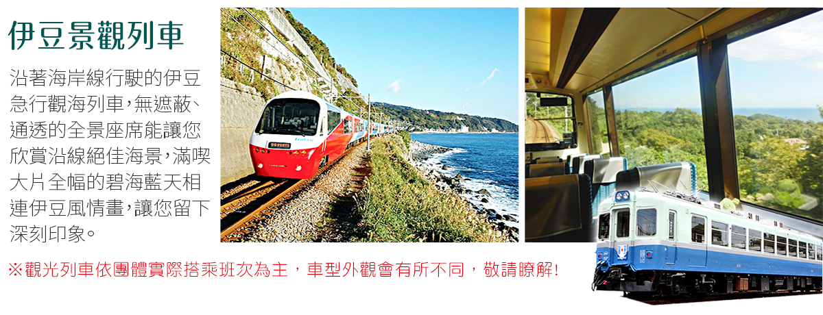 【伊東觀景列車(河津站-伊豆高原站)】是一趟充滿魅力的鐵路之旅,讓遊客在舒適的車廂內,邊欣賞壯麗的海岸風光,邊享受美好的旅程。這條路線經過了伊豆半島最美的景點之一,將自然景觀與藝術結合,讓每位乘客都能感受到身心的放鬆。列車的設計十分獨特,車廂大面積的落地窗讓旅客能夠無障礙地觀賞沿途的美景,無論是清晨的陽光灑在海面上的金色波光,還是黃昏時分的溫暖夕陽,這一切都成為難忘的回憶。途經的河津川、熱帶植物和綠意盎然的山坡,為旅程增添了無窮的美感。