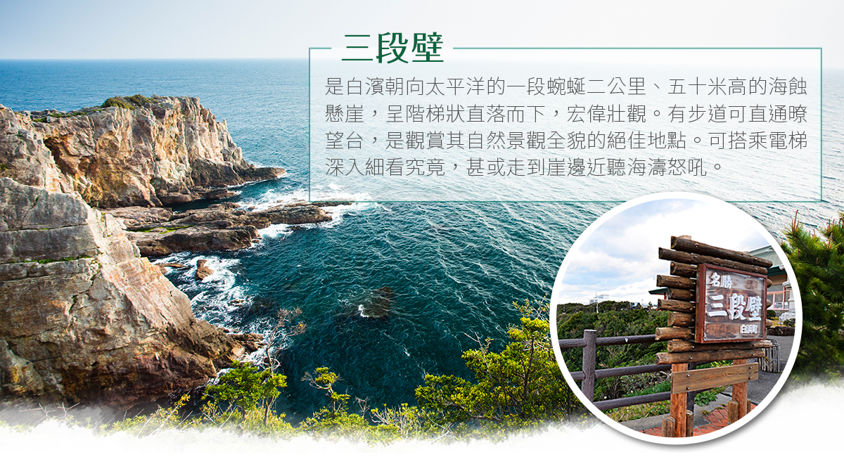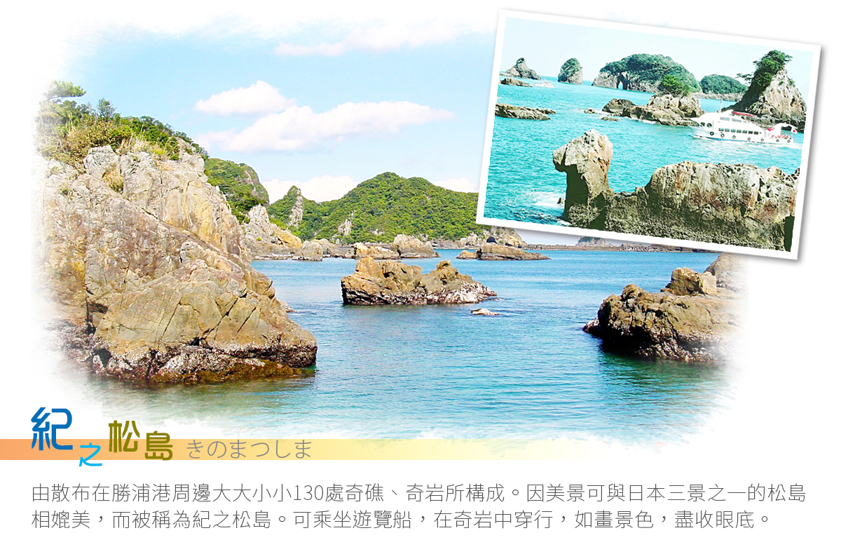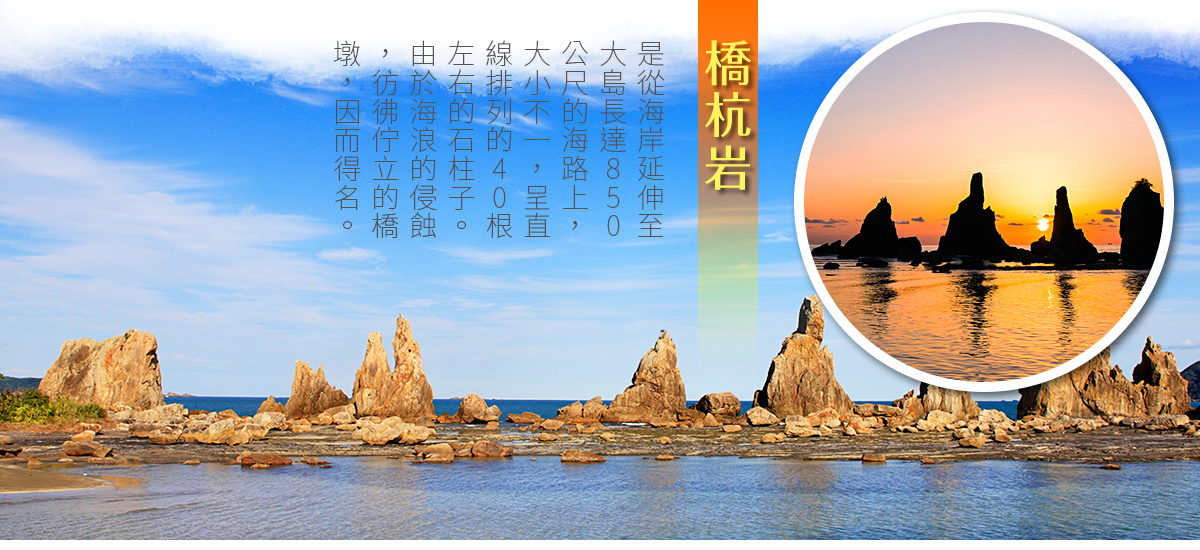 【鬼城奇岩海岸】世界遺産熊野古道一部分的「鬼城」這個讓人毛骨悚然地名,早在千年前的平安時代,如鬼般讓人心生恐懼的海賊以此地為根據地並聚集於此,當時被稱為「鬼之岩屋」,到了室町時代(16世紀),熊野國領主在山頂上築了城堡,從此被稱為「鬼城」;獅子岩是位於七里御浜(海岸),相貌神似獅子的巨大奇岩。千年的海蝕與地盤隆起形成了現在高約25公尺,周圍約210公尺之獅子形狀巨岩挺立在海岸邊,這尊面對熊野灣,威武獅吼的獅子岩無疑是大自然創作的藝術品。