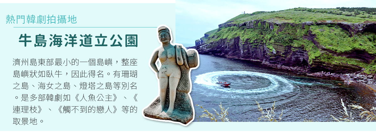 【牛島海洋道立公園(含渡輪船票+島上觀光巴士)】濟州島東部最小的一個島嶼,有珊瑚之島、海女之島、燈塔之島等別名的牛島是多部韓劇《人魚公主》、《連理枝》、《觸不到的戀人》取景之地。整座島嶼狀如臥牛,因此得名牛島。2001年1月1日將島上2個港口(牛島港與下牛牧洞港)週邊與牛島海上一帶25,863㎢的區域指定為牛島海上郡立公園。整體地勢平緩,與海相臨處絕壁陡立。著名的觀光景點包括牛島峰、龍洞、牛島博物館及珊瑚海水浴場,島上觀光巴士依順序繞行。