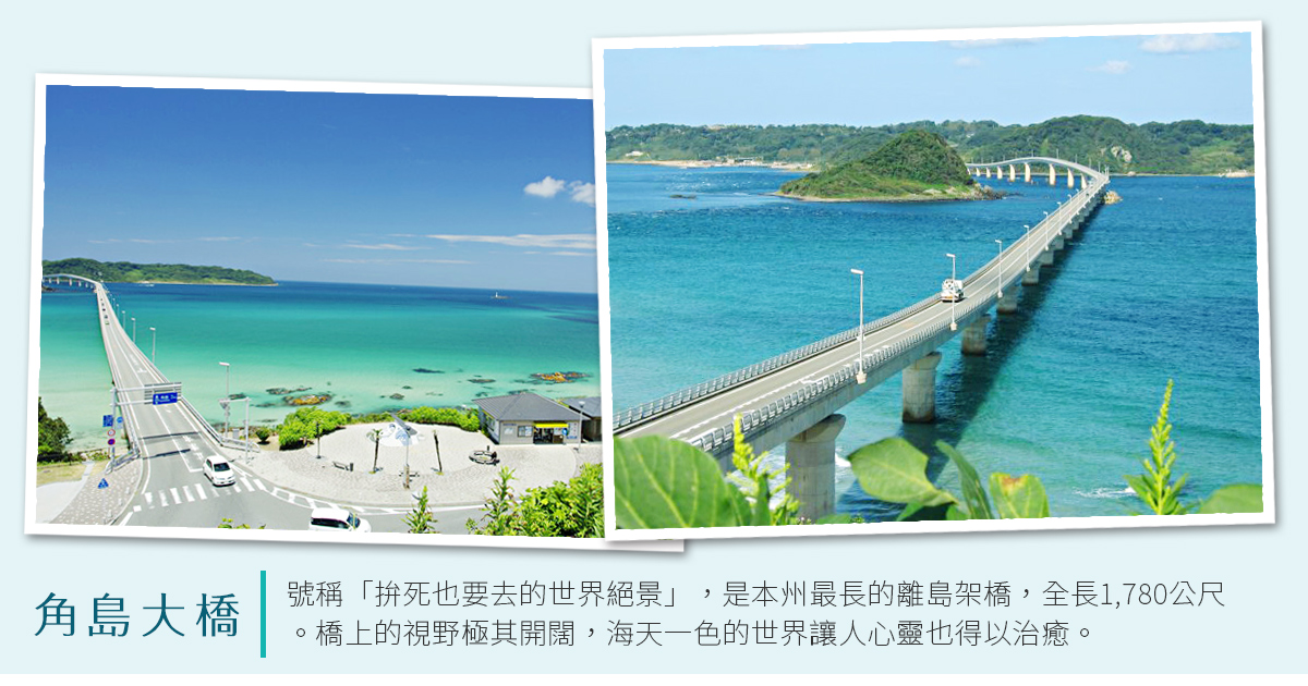 【角島大橋】山口縣下関市的角島以前只能是坐船去的,但是自從2000年完成了角島大橋之後可以通往陸地了。角島大橋的特徵是橋的高度不是很高,而且考慮了周邊的景觀而建造的,並且時速限制在40碼,在安全面也做了十分周全的考慮。日本超人氣偶像劇『HERO』拍攝點,也經常在汽車的廣告中登場,角島大橋全長1780米是日本當今第二長橋。