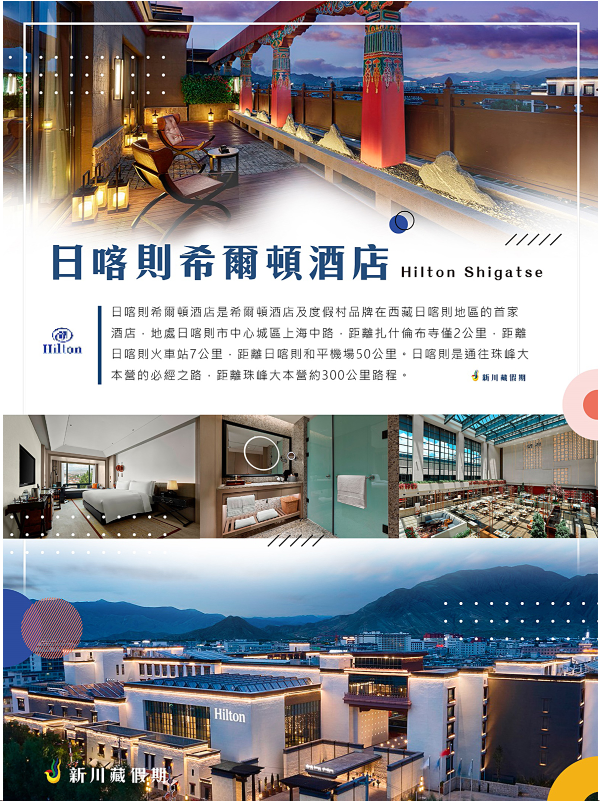 日喀則希爾頓酒店是希爾頓酒店及度假村品牌在西藏日喀則地區的首家酒店。酒店擁有 301 間舒適客房,客房設計以周邊山巒起伏的自然風景為靈感依託,採用天然木材和現代風格的色調營造出舒適的溫馨感。定制的藏式傢俱及裝飾、高速無線上網服務、寬敞的獨立淋浴間及瑰珀翠品牌洗護備品等,使賓客擁有身心愉悅的休憩時光。同時,為了緩解賓客在高原地區產生的缺氧不適等情況,酒店在客房備有彌散式和鼻吸式供氧設施,幫助客人更好地適應當地環境,享安全舒心假期。