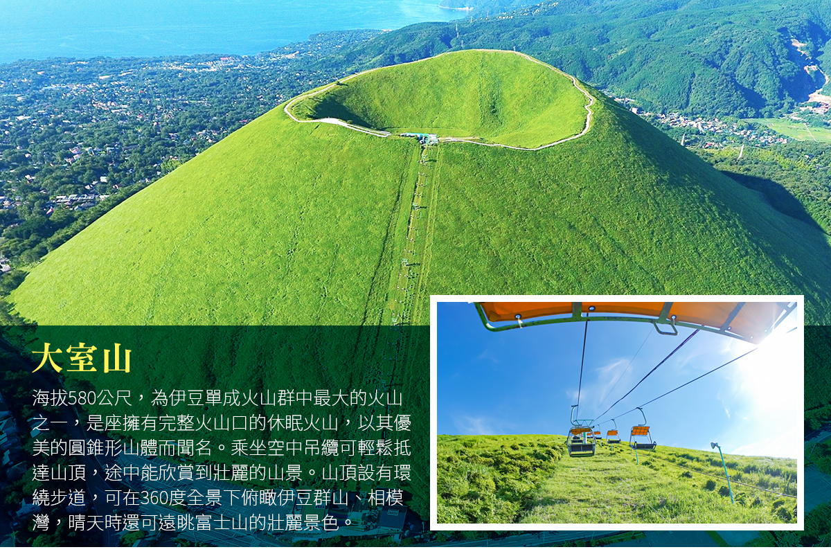 大室山登山纜車 位於靜岡縣伊豆高原,是伊豆代表性的自然地標。搭乘單人開放式登山纜車,約 6 分鐘即可輕鬆登上海拔 580 公尺的大室山山頂。抵達後可沿著火山口環狀步道漫步一圈,約 20–30 分鐘,沿途可欣賞伊豆半島、相模灣全景,天氣晴朗時更可遠眺富士山。