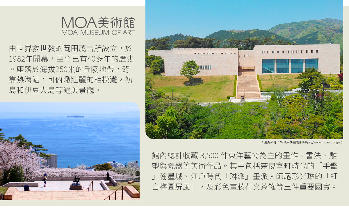 MOA美術館 是一座以收藏東亞藝術珍品及壯麗海景聞名的私立美術館。擁有約 3,500 件作品,包括 3 件國寶(如尾形光琳的《紅白梅圖屏風》)及多件重要文化財。室內天花板設有巨大的萬花筒光影投影,隨音樂變換色彩,是熱門的打卡點。