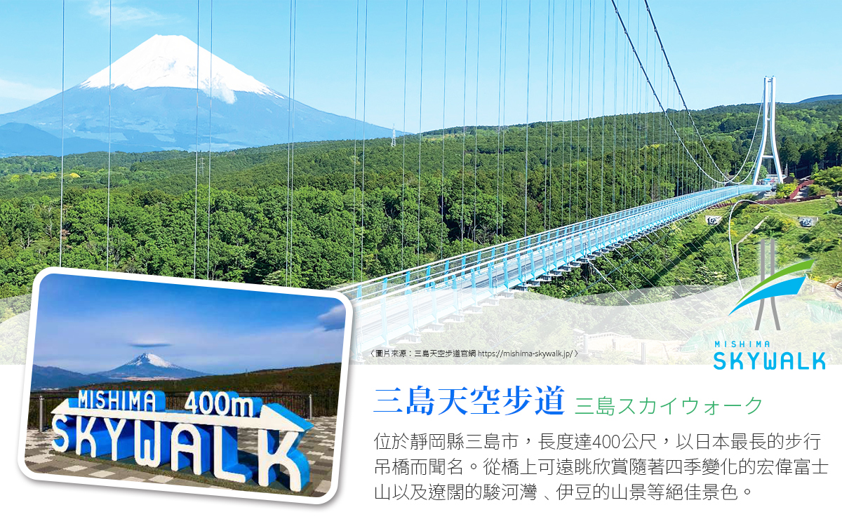 三島SKY WALK 日本最長的人行吊橋,全長約 400 公尺,橫跨深谷與森林。漫步橋上可欣賞壯麗山景,天氣晴朗時可遠眺富士山,腳下溪谷景色一覽無遺。園區內設有展望台、咖啡廳與多項戶外體驗設施,結合自然景觀與休閒樂趣,是伊豆與箱根地區人氣觀光景點,適合各年齡層旅客造訪。