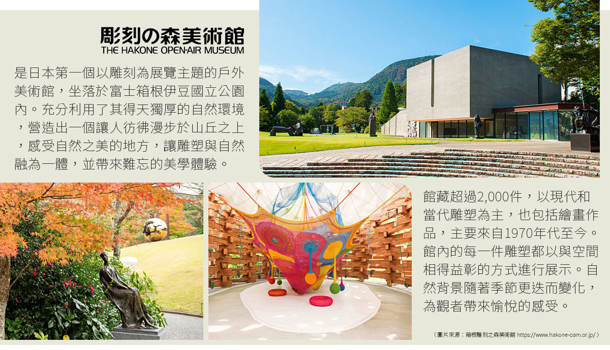 雕刻之森 是日本首座戶外美術館,將現代雕塑作品與自然景觀完美結合。館內展示多位國際知名藝術家的大型戶外作品,漫步其間可一邊欣賞藝術、一邊感受山林草原景色。