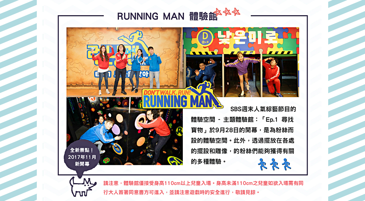 RUNNING MAN體驗館】SBS 人氣綜藝節目主題體驗館誕生了!不要光看電視啦,讓自己成為真正的Running Man,成為電視裡的主角,闖關途中收集R幣,闖過重重關卡,尋找隱藏在Running Man的寶物,就有機會成為真正的Running Man