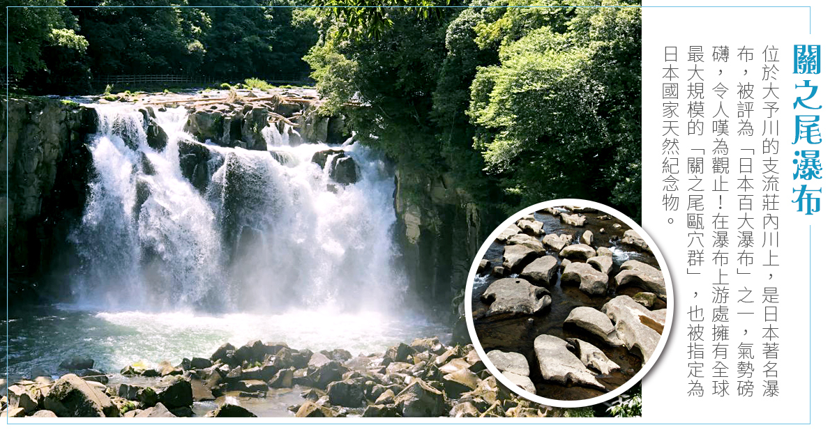 【關之尾瀑布】是宮崎最大、最磅礴的瀑布之一。站在吊橋上可見一川瀑布飛流直下,傾瀉到下方的火山岩。如果要拍照手腳要快,否則相機會被淋濕。瀑布頂端相當值得駐足欣賞、拍照留念。天氣多雲時,瀑布頂端的景色會更加令人迷醉。