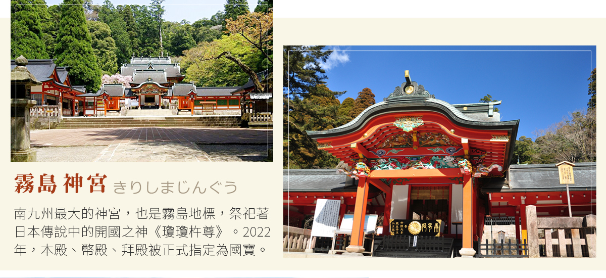 【霧島神宮】霧島之所以名「島」,是因為這裡的山脈常被雲霧環繞,隱約可見的山峰有如在海上浮起的小島般。霧島也是與神靈有著深厚淵源之地,自古以来傳說為「天孫降臨之地」,傳說日本是由這裡開始的。霧島神宮是尊奉天神最高級别的神社。霧島神宮據說是6世紀時為了祭祀建立日本皇朝的天神瓊瓊杵尊而建。而現在的神殿是18世紀時重建的。霧島神宮被指定為國家級的國寶,不僅是日本國內外遊客,會慕名而來只為一睹神宮的風采。
