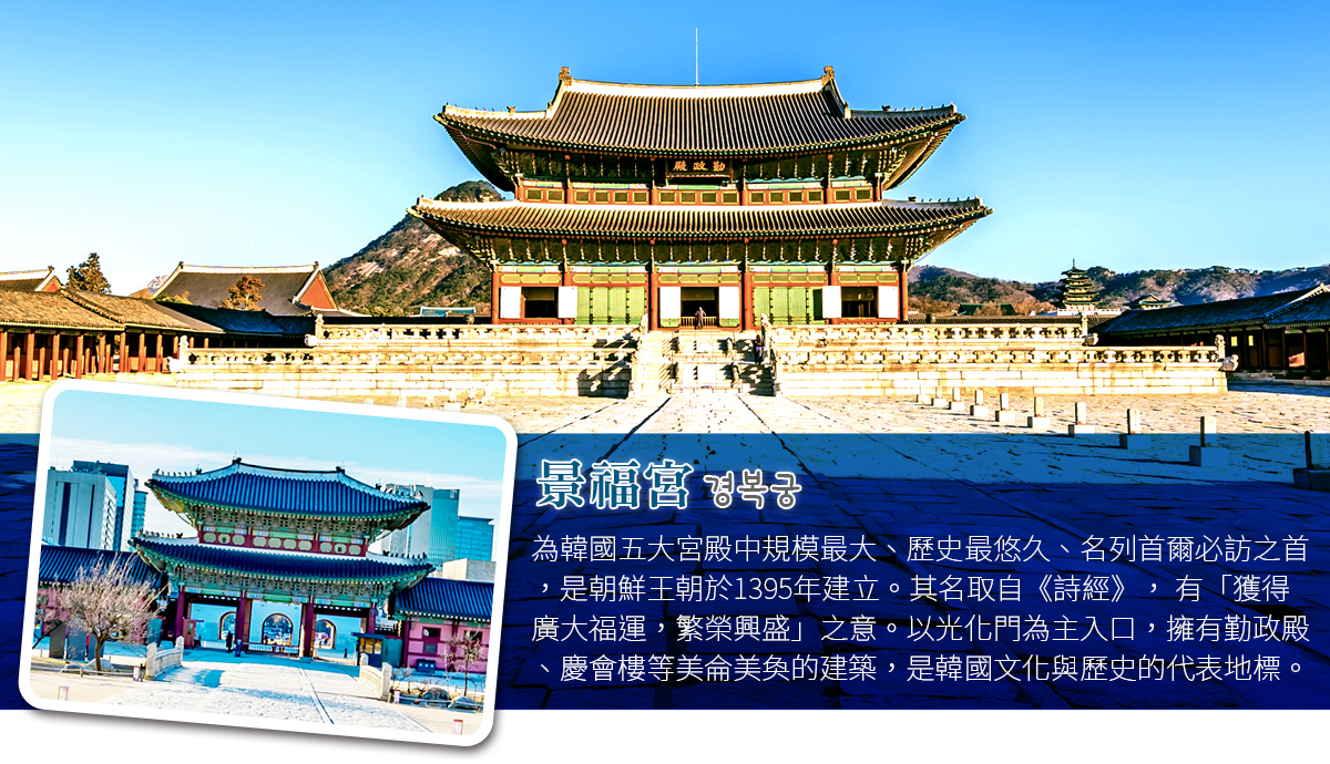 【景福宮】景福宮內最具朝鮮代表性建築的慶會樓與香遠亭蓮花池,至今仍保有當時的面貌。勤政殿的月臺(宮殿正殿前寬廣的平臺)與石雕等,也都是當時雕刻藝術的代表。目前興禮門外西側建有國立古宮博物館,景福宮內香遠亭東側則有國立民俗博物館。