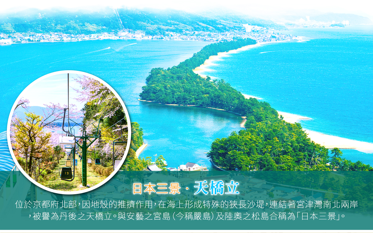 【傘松公園展望台】從天橋立看來傘松公園就像是對岸西國第28名剎成相寺的山腳下的寬廣的公園。為「橋立三大奇觀」之一,「胯下觀景」名勝很有名,園內也設立了胯位於成相山山腰上是可將天橋立周邊美景盡收眼底的最佳地點,站在著名的「胯間展望台」上,彎下腰由兩腿之間看出去,讓天幕與海面顛倒過來,天橋立彷彿是一條在空中騰雲駕霧的飛龍,又像是一座從天而降的一字橋,您可以讓想像力自由馳騁,靜心觀察大自然優美絕妙的巧奪天工。