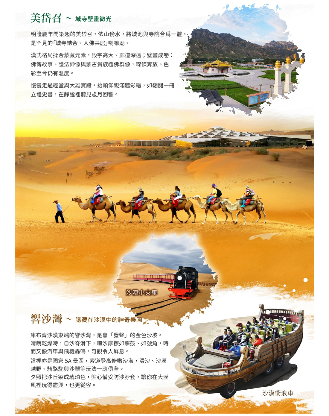 【響沙灣】國家 5A 級旅遊景區,“銀肯”為蒙語,漢譯為“永久”之意,為中國三大鳴沙山之一,融匯了雄渾的大漠文化和深厚的蒙古底蘊,匯萃了激情的沙漠活動與獨特的民族風情,擁有世界第一條沙漠索道、中國最大的駱駝群、中國一流的蒙古民族藝術團。進行沙漠活動:鄂爾多斯婚禮、小火車、衝浪車、騎駱駝、滑沙。