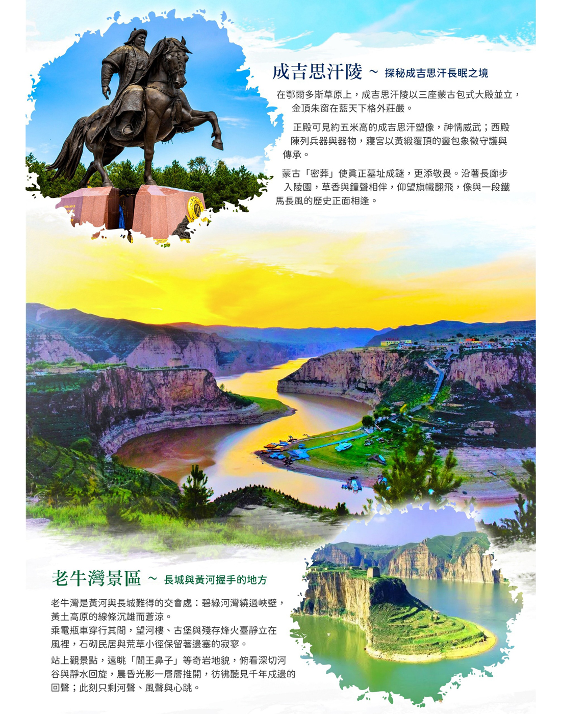 【成吉思汗陵園】這裏藍天如碧,蒼松翠柏,綠草如茵,牧馬嘶鳴,牛羊成群,簇擁著聖主的陵寢,巴音昌呼格河的涓涓溪水環繞著聳立在阿拉騰甘德爾敖包旁邊的陵園,主體建築是三座蒙古包式的大殿,正殿內有一座高約 5 米的成吉思汗塑像,後面的寢宮裏有三個黃緞子覆頂的蒙古包,西殿裏陳列有成吉思汗當年用過的兵器。
