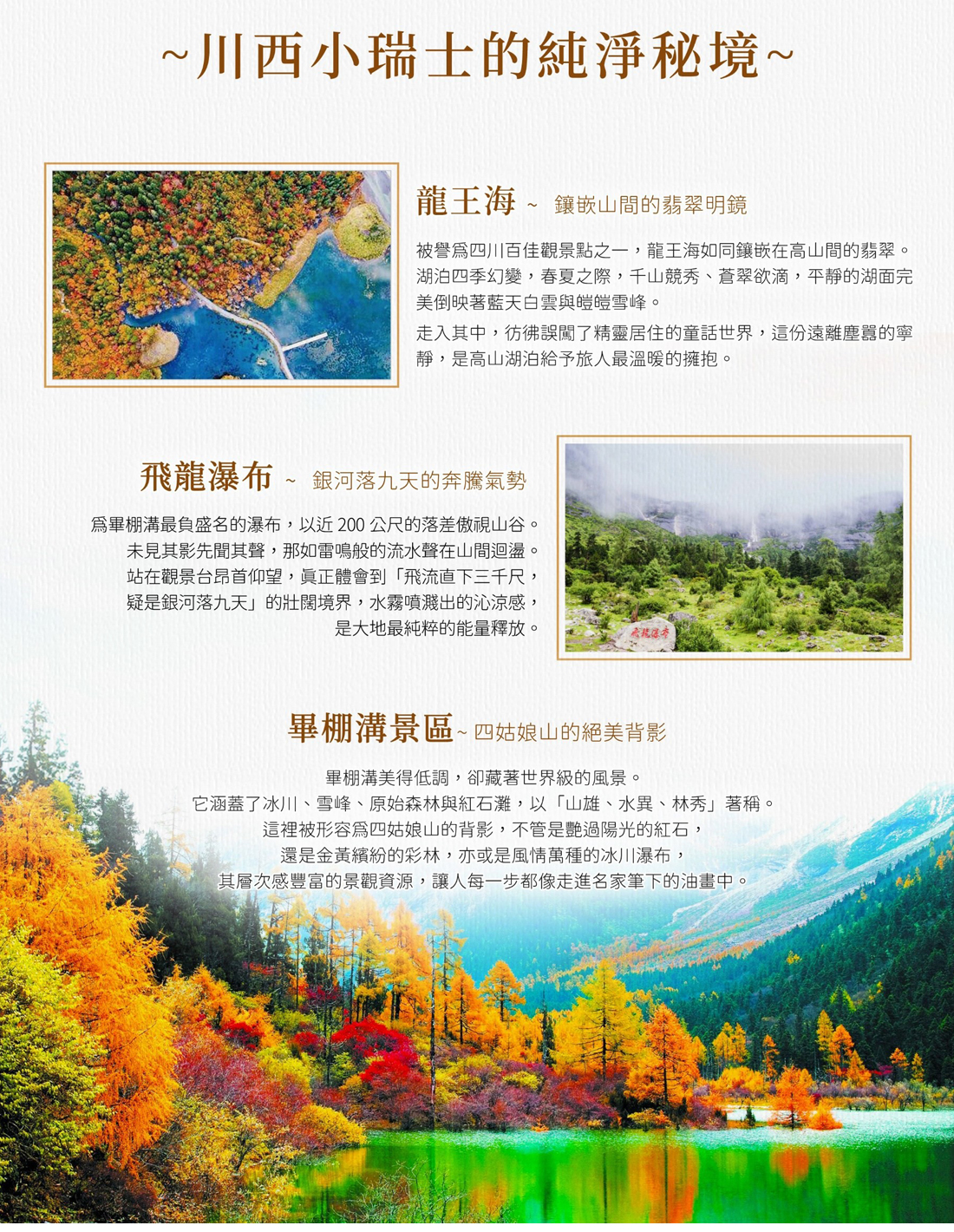 九寨溝風景區九寨溝是大自然鬼斧神工之傑作。四周雪峰高聳,湖水清澈豔麗,飛瀑多姿多 彩,急流洶湧澎湃,林木青蔥婆娑。藍藍的天空,明媚的陽光,清新的空氣和點綴其間的古老村寨、棧橋、磨 坊,組成了一幅內涵豐富、和諧統一的優美畫卷,歷來被當地藏族同胞視為“神山聖水”。這裏因有九個藏族村寨而得名。共分三條溝:日則溝、樹正溝、則查窪溝 3 條主溝。景觀分布在樹正、諾日朗、劍岩、長海、扎如、天海六大景區。此外風景的精華是令人歎而觀止色彩斑爛晶瑩透明的 108 高山海子。九寨溝以高山湖泊群 和瀑布群為其主要特點,集湖、瀑、灘、流、雪峰、森林及藏族風情為一體,因其獨有原始自然美,變幻無窮的四季景觀,豐富的動植物資源被譽為「人間仙境」「童話世界」讓您走進九寨溝,將陶醉於最高的美的享受。