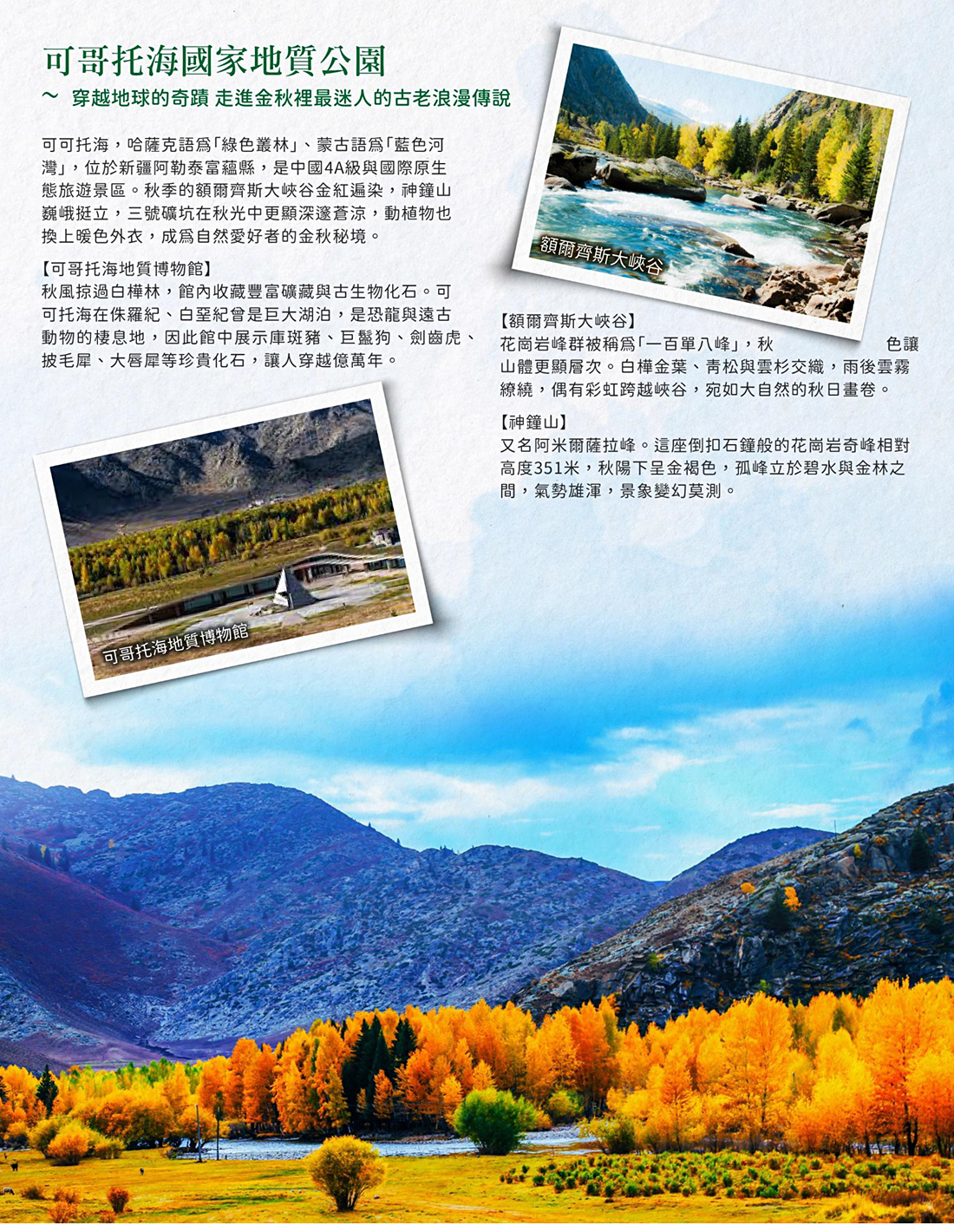 ★【可哥托海國家地質公園】綠色的叢林、藍色的河灣;由“世界地震博物館”之稱的卡拉先格爾地震斷裂帶、“北國江南”之譽的可哥蘇裏風景區、“中國第二寒極”伊雷木湖及著名的額爾齊斯大峽谷四大景區組成。