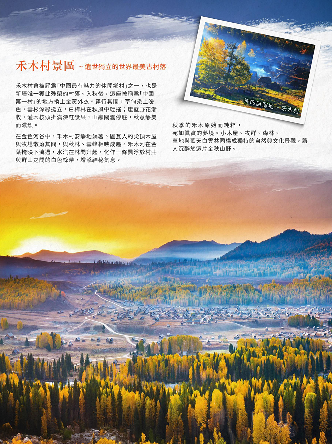 【禾木觀景台】登上觀景台禾木村莊盡收眼底,雪山樺林和古老的木屋,使得整個禾木就像一幅淡雅 的水墨畫。當太陽爬上村子東面的山頭,晨曦也跟著慢慢散去,炊煙便一個一個地從圖瓦人居住的木 屋中嫋嫋升起。