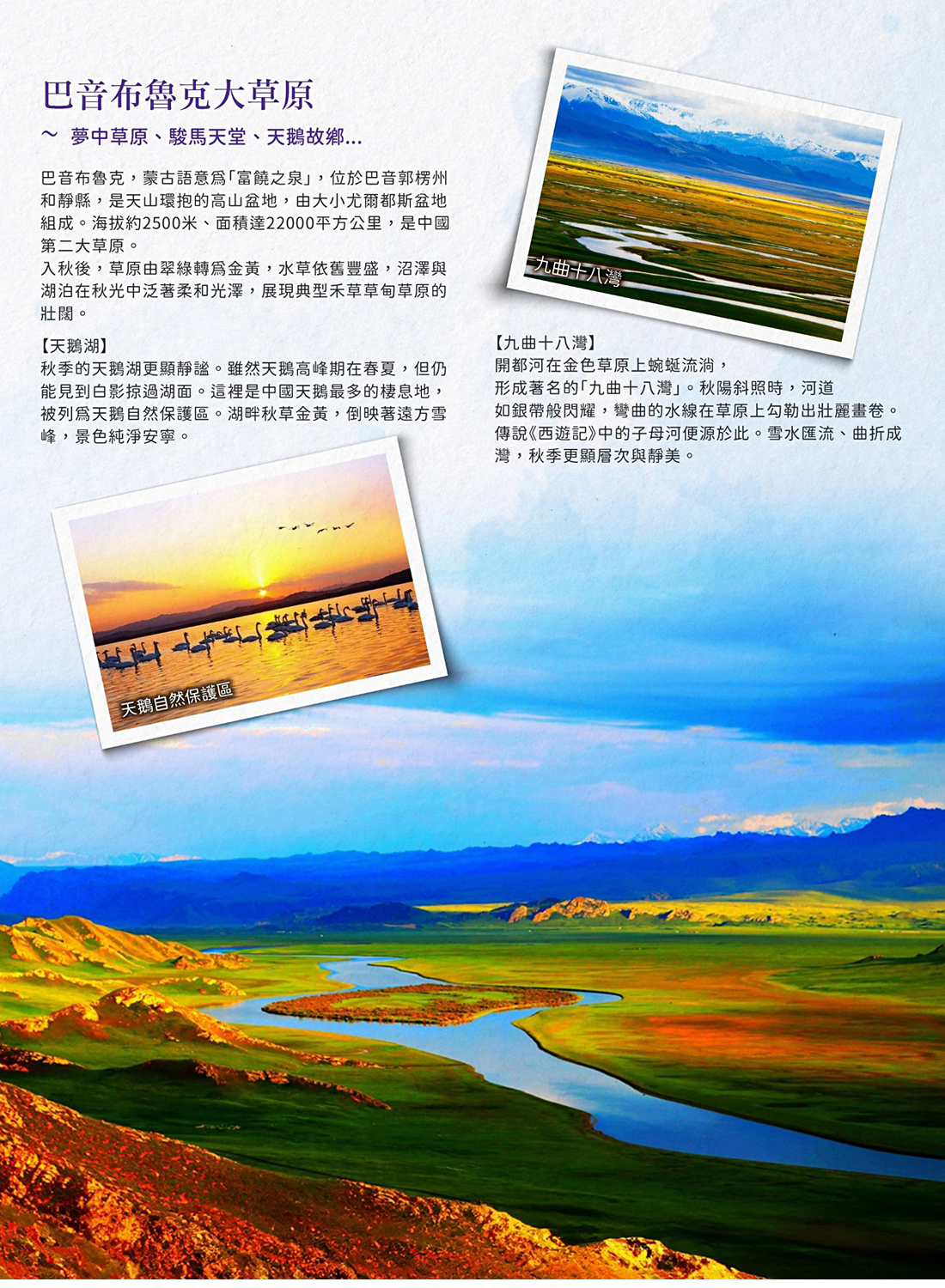 ★【巴音布魯克+九曲十八灣景區+天鵝湖濕地】蒙古語”富饒之泉”的意思,幅員遼闊、水草豐美,一望無際碧綠的草原。