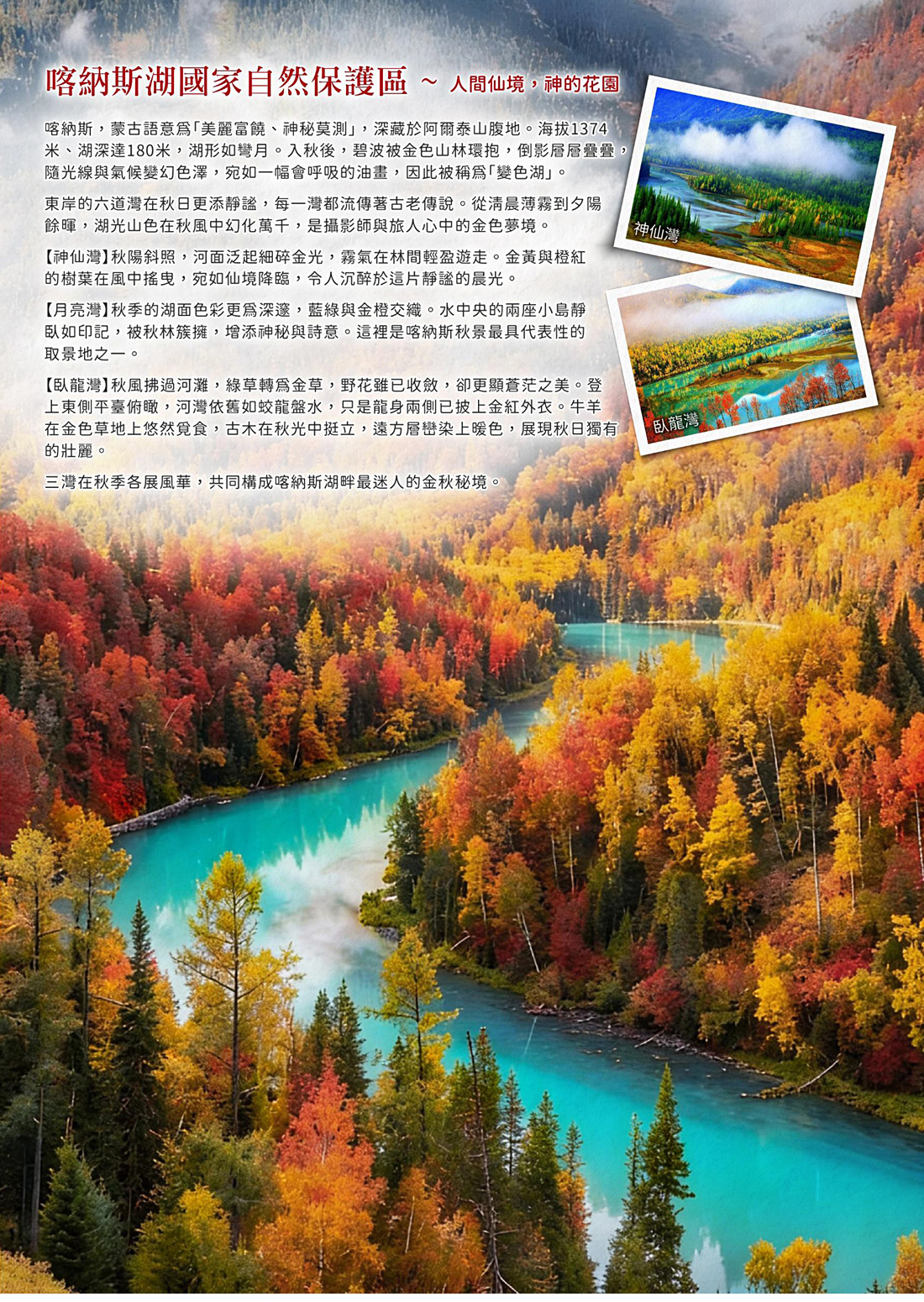 ★【喀納斯湖國家自然保護區】人間仙境、東方瑞士&阿爾泰山最美的高山湖泊-臥龍灣、月亮灣、神仙灣以及鴨澤湖等經典美景觀賞。