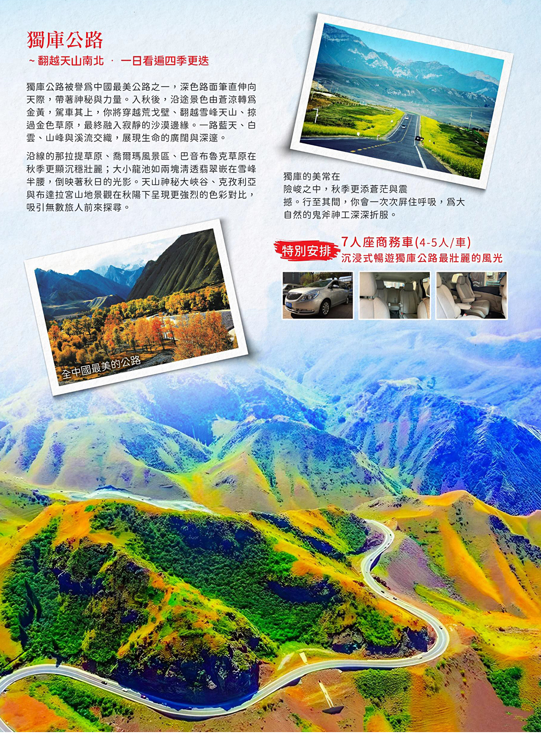 穿越中國大陸美麗的公路之—【獨庫公路】,宛如一條巨龍盤臥天山。然而只隔這一座山,卻是從火焰 到海水的冰火兩重天體驗!它連接南北疆,橫亙崇山峻嶺、穿越深山峽谷,沿途有風光旖旎的茫茫草 原,也有參天蔽日的雲山雪嶺。一路冒險,沿途看不盡美景,這不是一條平凡的路,而是一條冒險之 路。任何去這條路的人都不會後悔!獨庫公路橫穿天山山脈,被譽為“中國大陸最美公路”。獨庫之 美一天有四季,十裡不同天。在擁有草原、冰川、雪山、沙漠、湖泊多種地貌形態的新疆,獨庫公路 就是一副別樣風景。