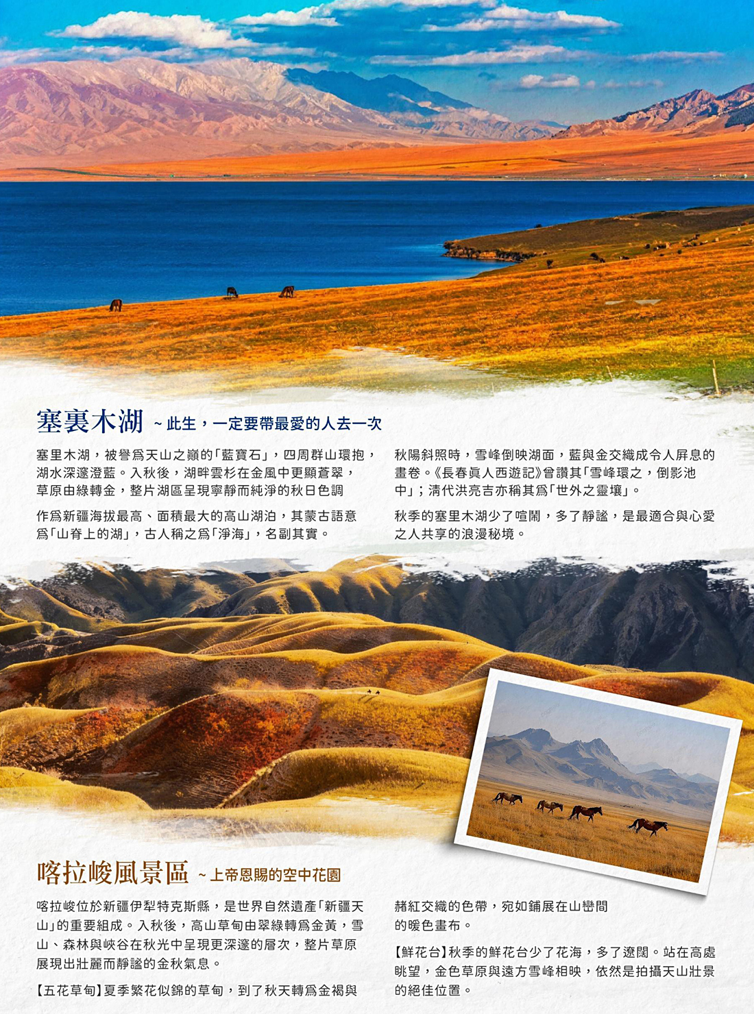 【塞裏木湖-含區間車】蒙古語意為「山脊梁山的湖泊」,是新疆海拔最高、面積最大的高山湖。賽裏 木湖水深邃湛藍,湖畔雲杉蒼翠,牧草如茵,神奇、秀麗的自然風光深深烙印在你我心中。《長春真 人西遊記》中就曾稱頌賽裏木湖景色綺麗,曰:「方圓凡二百里,雪峰環之,倒影池中,師名之日天 池」;清朝洪亮吉則譽之為「西來之境,世外之靈壤」。