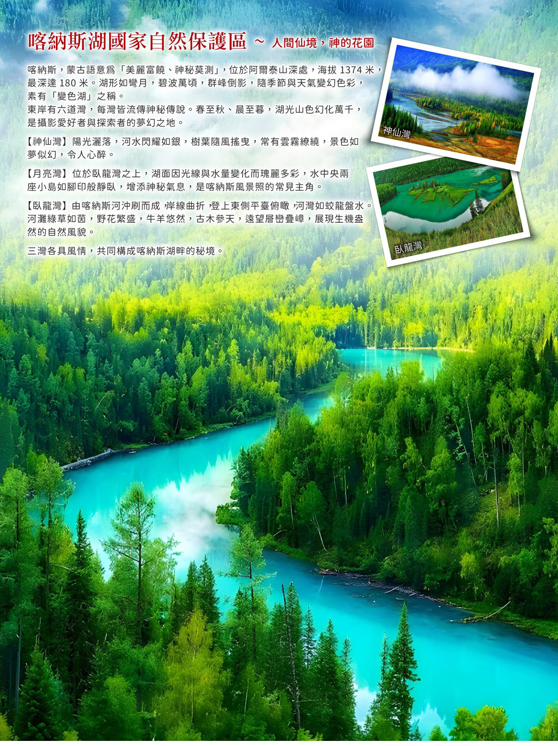 ★【喀納斯湖國家自然保護區】人間仙境、東方瑞士&阿爾泰山最美的高山湖泊-臥龍灣、月亮灣、神仙灣以及鴨澤湖等經典美景觀賞。