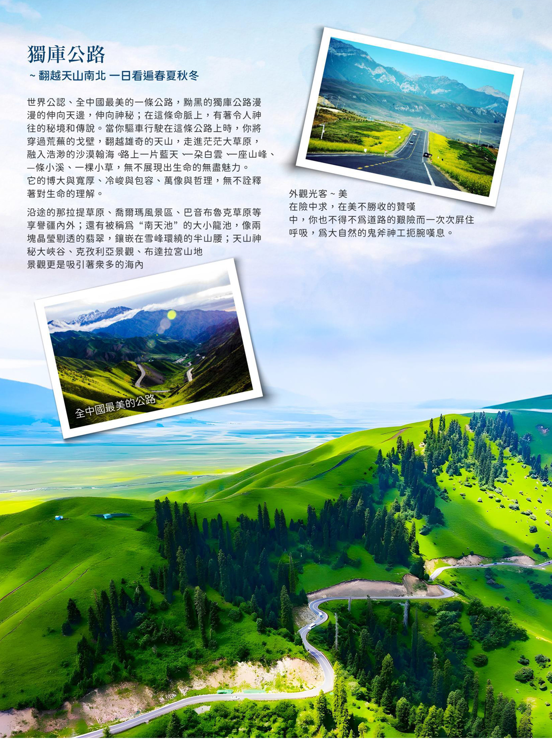 穿越中國大陸美麗的公路之—【獨庫公路】,宛如一條巨龍盤臥天山。然而只隔這一座山,卻是從火焰 到海水的冰火兩重天體驗!它連接南北疆,橫亙崇山峻嶺、穿越深山峽谷,沿途有風光旖旎的茫茫草 原,也有參天蔽日的雲山雪嶺。一路冒險,沿途看不盡美景,這不是一條平凡的路,而是一條冒險之 路。任何去這條路的人都不會後悔!獨庫公路橫穿天山山脈,被譽為“中國大陸最美公路”。獨庫之 美一天有四季,十裡不同天。在擁有草原、冰川、雪山、沙漠、湖泊多種地貌形態的新疆,獨庫公路 就是一副別樣風景。