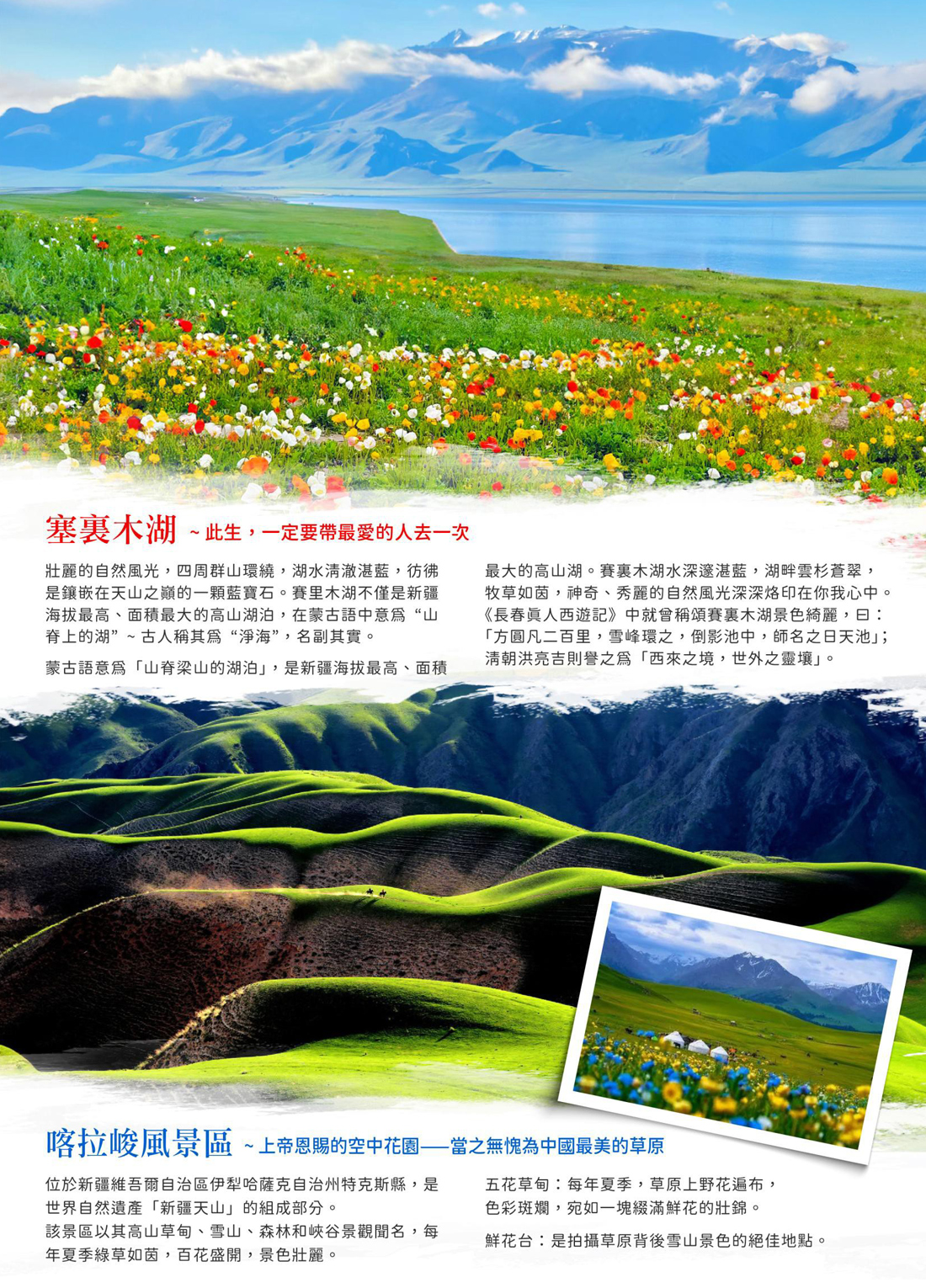 【塞裏木湖-含區間車】蒙古語意為「山脊梁山的湖泊」,是新疆海拔最高、面積最大的高山湖。賽裏 木湖水深邃湛藍,湖畔雲杉蒼翠,牧草如茵,神奇、秀麗的自然風光深深烙印在你我心中。《長春真 人西遊記》中就曾稱頌賽裏木湖景色綺麗,曰:「方圓凡二百里,雪峰環之,倒影池中,師名之日天 池」;清朝洪亮吉則譽之為「西來之境,世外之靈壤」。