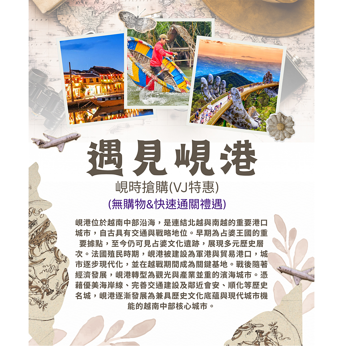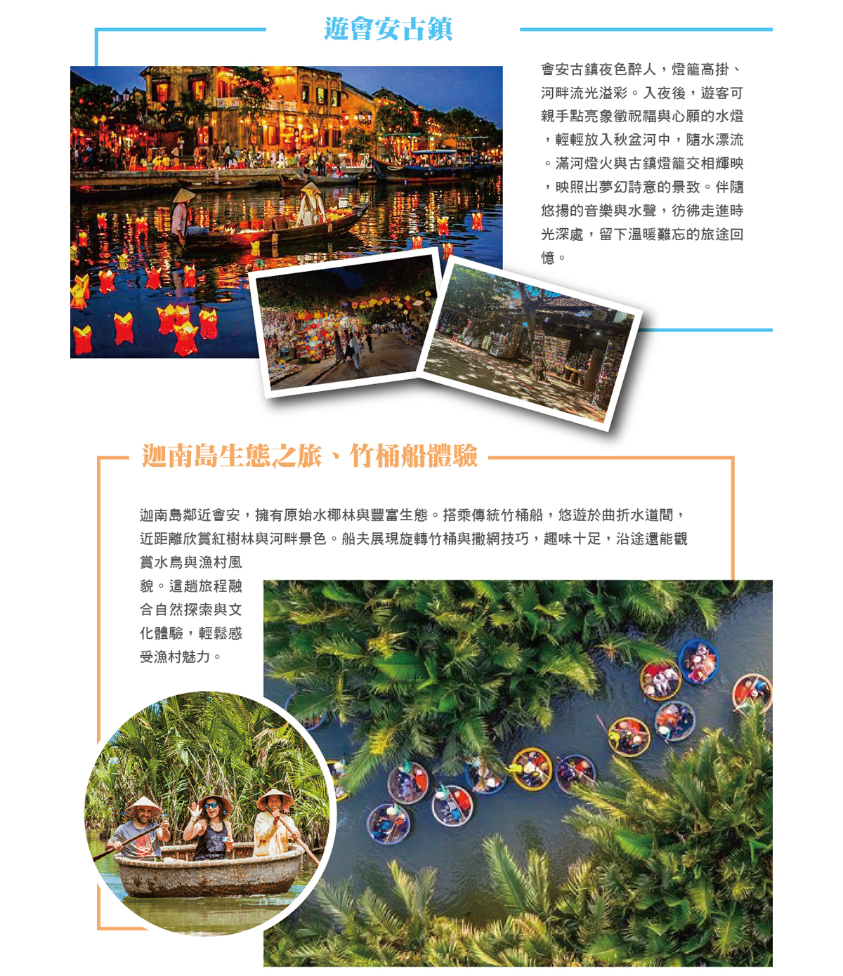 《會安古鎮~一座活生生的歷史博物館》像是披上鮮亮黃衣的中國小村子,鄰近還有充滿詩意的秋盤河,閒逛古城與河畔,讓您踏著慵懶的步調感受遠離文明的樂活人生,於 1999 年被世界文教組織認定為『世界文化遺產』